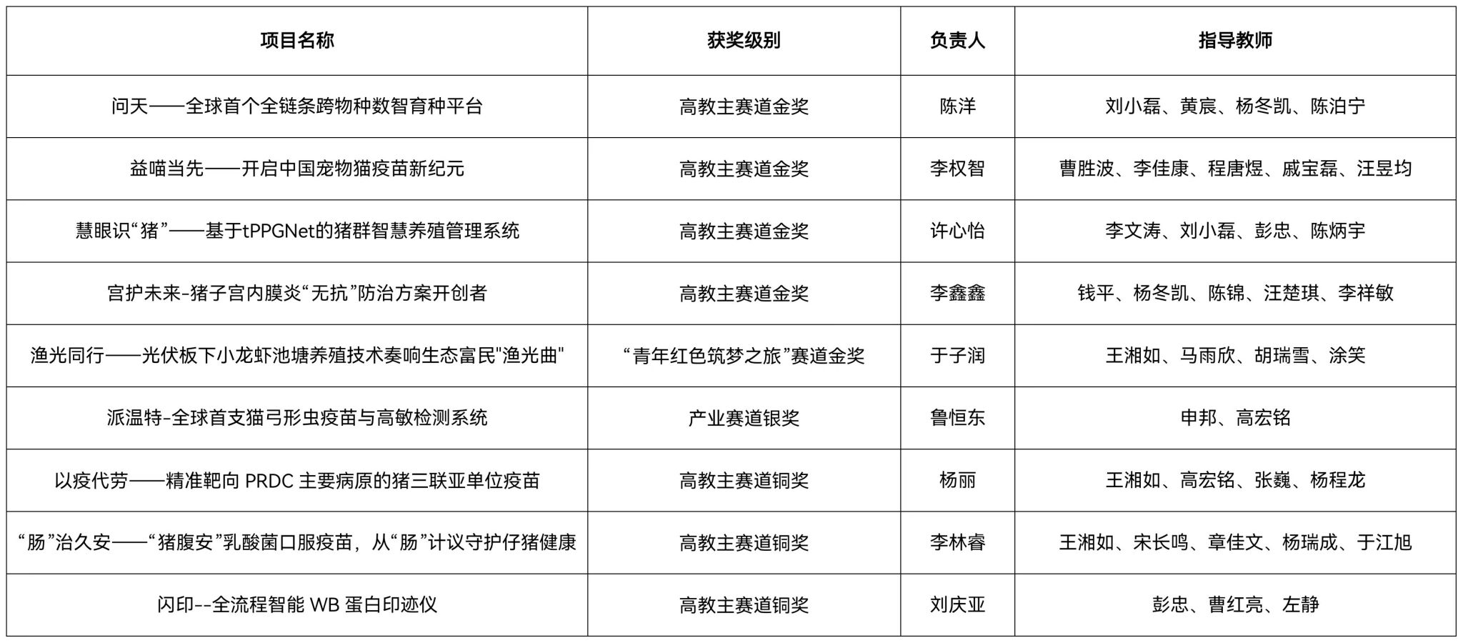 其中,“问天——全球首个全链条跨物种数智育种平台”“益喵当先——开启中国宠物猫疫苗新纪元”“慧眼识‘猪’——基于tPPGNet的猪群智慧养殖管理系统”获高教主赛道本科生创意组金奖;“宫护未来——猪子宫内膜炎‘无抗’防治方案开创者”获高教主赛道研究生创业组金奖;渔光同行——光伏板下小龙虾池塘养殖技术奏响生态富民‘渔光曲’”获“青年红色筑梦之旅”赛道创业组金奖。
